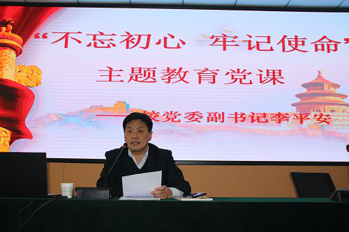 “不忘初心、牢记使命”主题教育安排,校党委副书记李平安讲读主题教育专题党课,机关党委、部分马院师生党员参加活动。