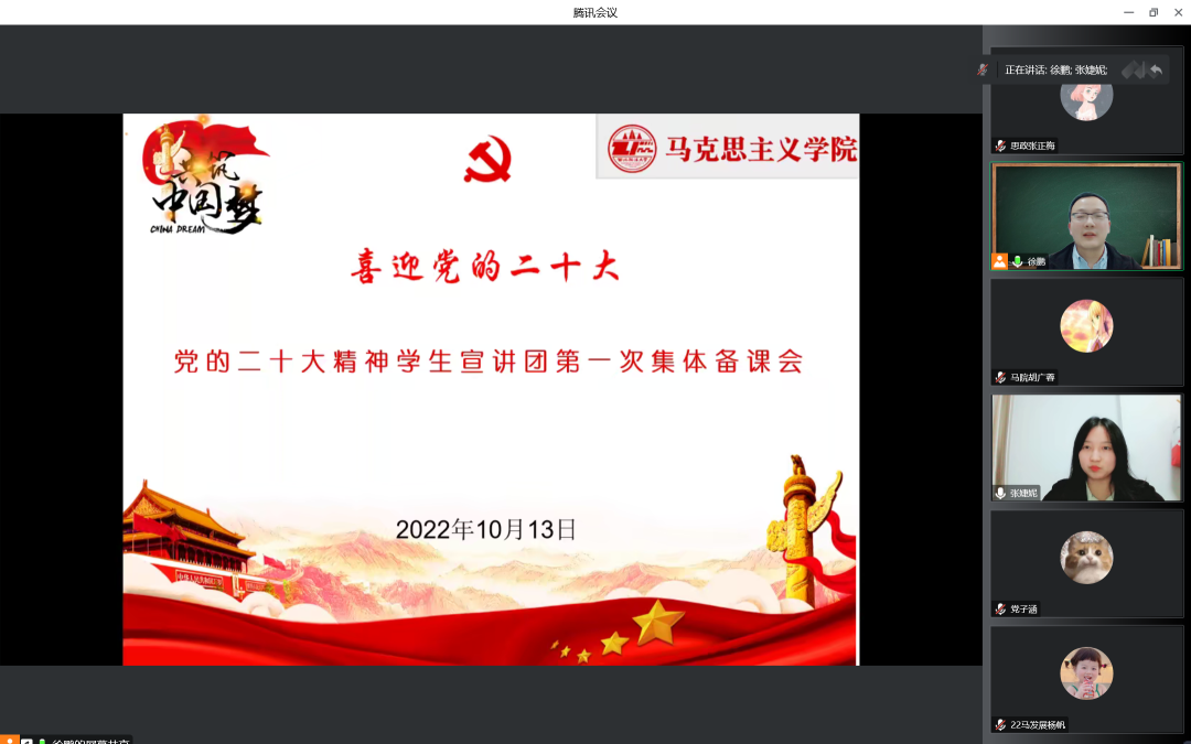 党的二十大召开在即,由党委宣传部、学工部、研工部和团委共同组织主办,明升M88 承办的党的二十大精神学生宣讲团积极酝酿成立,为彰显马理论专业学科优势,加强学生宣讲团队伍建设,提升宣讲团成员宣讲技巧和水平,10月13日晚7时,明升M88 召开党的二十大精神学生宣讲团第一次线上集体备课会。明升M88 副院长何彦新副教授、国家安全明升M88 辅导员张婕妮、明升M88 2020级研究生王心彤、丁婕以及党的二十大精神学生宣讲团全体成员参与学习交流。备课会由明升M88 学生党支部书记徐鹏主持。
