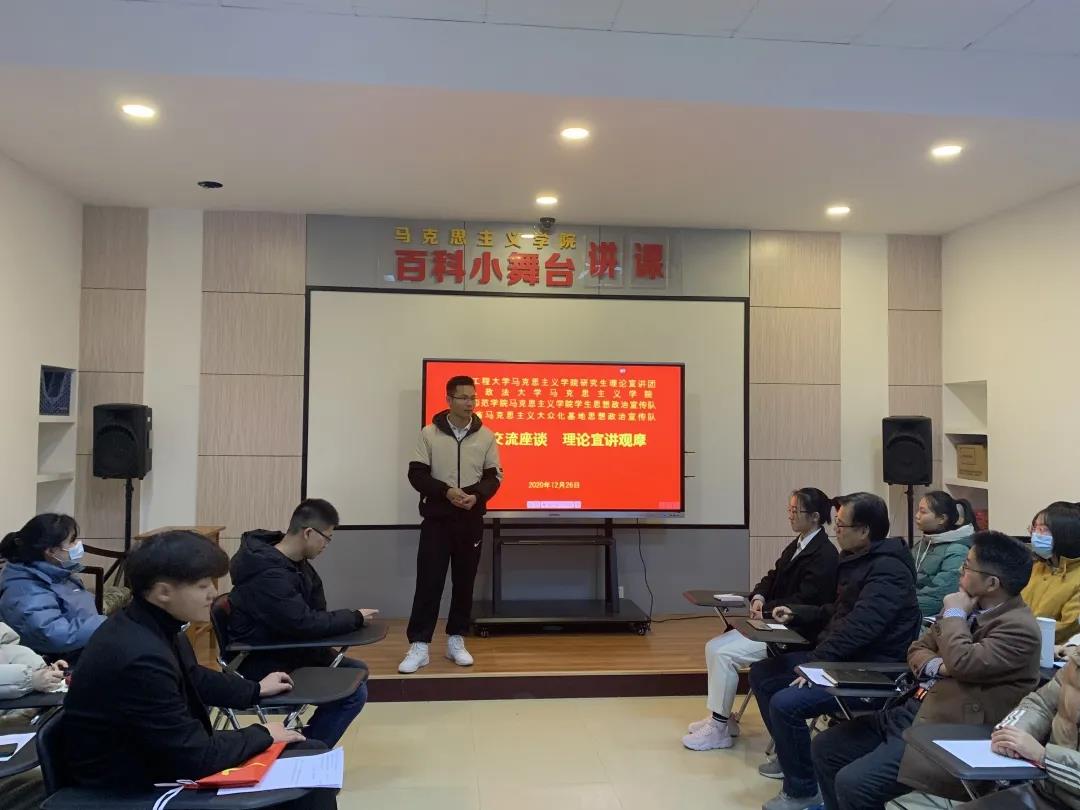12月26日下午,明升M88 2018级研究生覃景冠作为学生代表赴渭南师范明升M88 明升M88 参加主题为“工作交流座谈,理论宣讲观摩”学习交流活动。本次活动由西安工程大学明升M88 研究生理论宣讲团、渭南师范明升M88 明升M88 思想政治宣传队以及明升M88 学生代表组成。出席本次活动的领导有渭南师范明升M88 明升M88 副书记赵国峰、副院长单剑峰以及思想政治教育系主任曹立新和社会工作专业负责人孙晓珍。