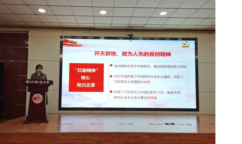 第一位宣讲人王心彤同学以“开天辟地的大事变”为题,从一艘小小的红船出发探寻中国共产党建党的艰辛历程。在建党百年之际回首党的伟大征程,让建党的起点和建党的一百周年在2021年进行一场奇妙的碰撞,感受开天辟地的大事变为我们新时代所带来的意义。在应运而生的红船精神中体会历久弥坚的百年初心,在精神领略中践行青年使命担当。