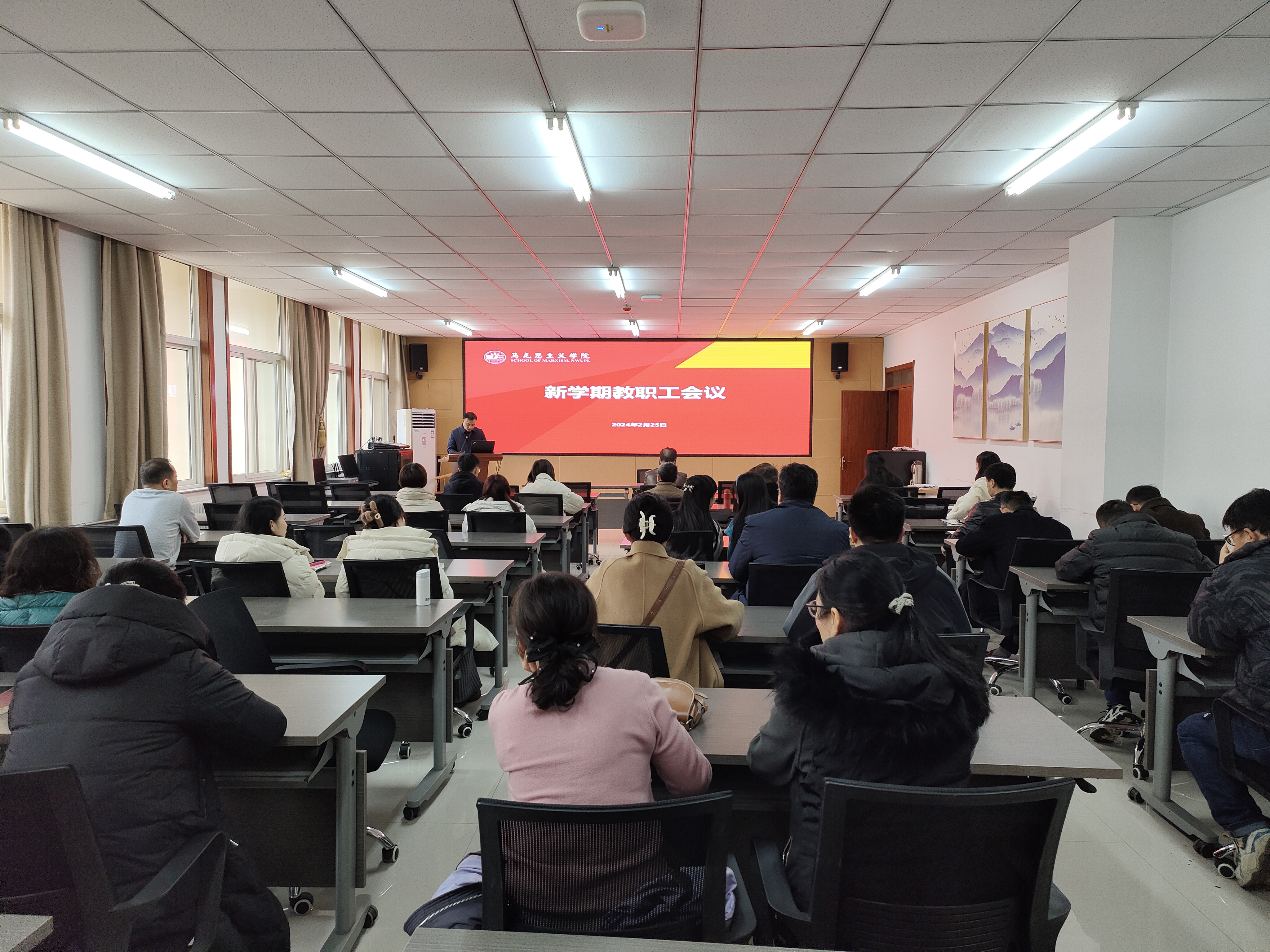 在会议室召开新学期全院教职工工作会议,总结上年度工作情况,安排部署本年度重点工作。会议由副院长何彦新主持。