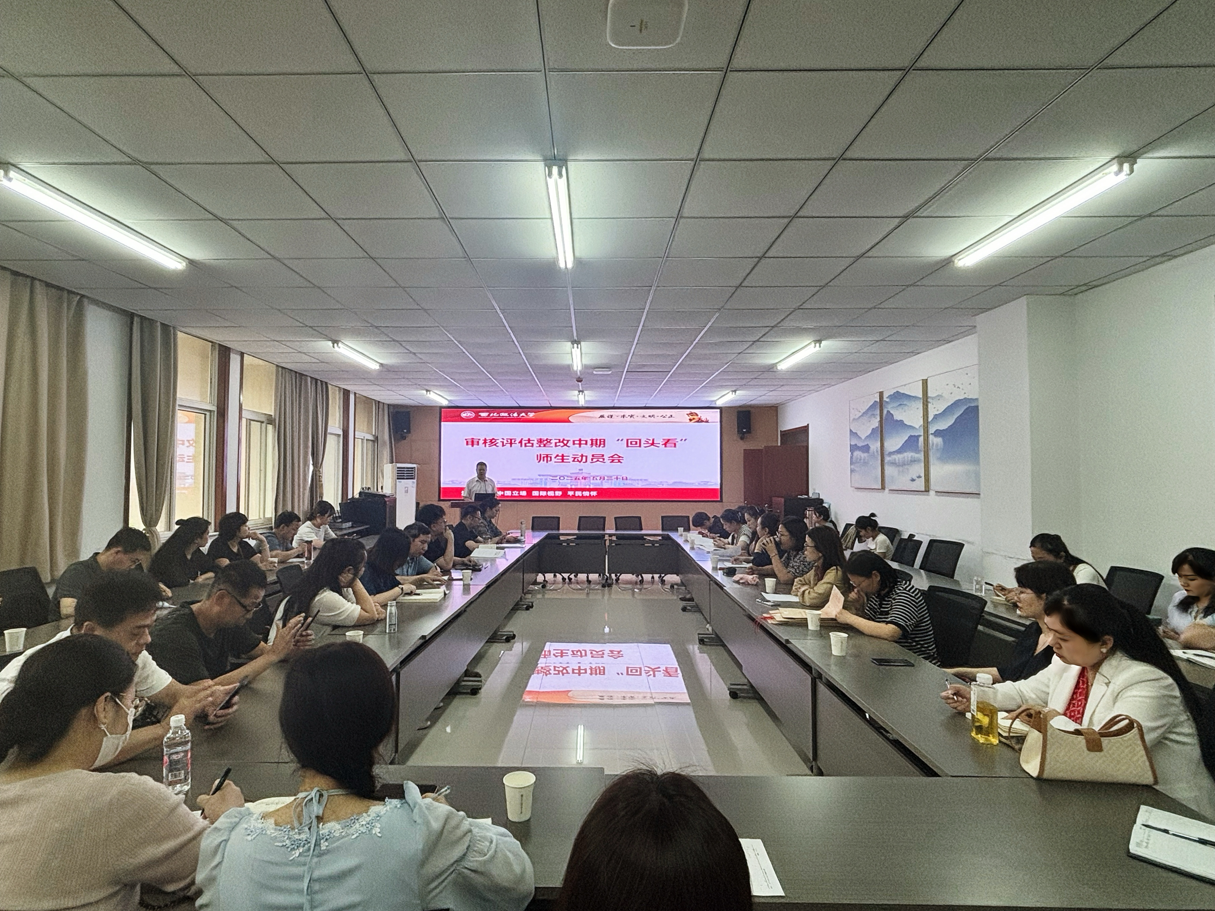 于诚意楼五楼会议室召开审核评估整改中期“回头看”师生动员会,会议由明升M88