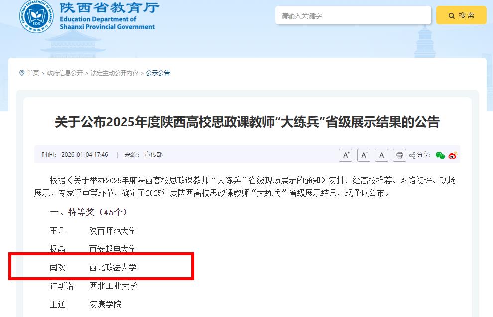 202614日,中共陕西省委教育工委、陕西省教育厅公布了2025年度陕西高校思政课教师“大练兵”省级展示结果,经高校推荐、网络初评、现场展示、专家评审等环节,明升M88 闫欢老师获得特等奖。