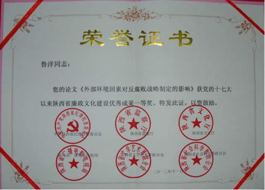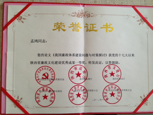 在中共陕西省纪委、陕西省监察厅、陕西省文化厅、陕西省广播电影电视局、陕西省文学艺术界联合会、陕西省社会科学界联合会等单位联合组织的表彰党的十七大以来陕西省廉政文化建设优秀成果活动中,明升M88 青年教师孟鸿博士的论文《我国廉政体系建设问题与对策探讨》、鲁洋博士的论文《外部环境因素对反腐败战略制定的影响》荣获理论研究成果类一等奖。此次评奖表彰活动组织部门权威、社会各界参与广泛、受关注程度很高、社会影响很大。