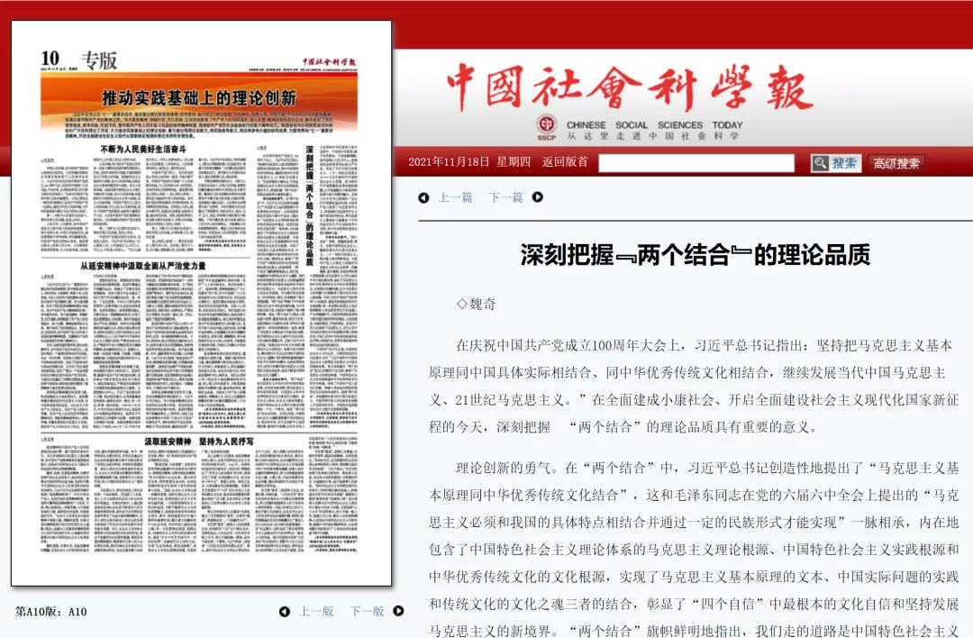 2021年11月18日,《中国社会科学报》刊发明升M88 院长魏奇教授《深刻把握“两个结合”的理论品质》一文。文章强调在全面建成小康社会、开启全面建设社会主义现代化国家新征程的今天,深刻把握 “两个结合”的理论品质具有重要的意义。现将全文转载如下。