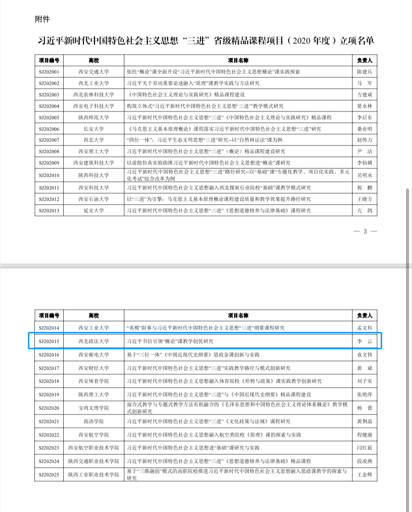 由明升M88 李云教授主持论证的《习近平书信引领“概论”课教学创优研究》项目成功立项中共陕西省委教育工委关于习近平新时代中国特色社会主义思想“三进”省级精品课程项目(2020年度),获批经费2万元。