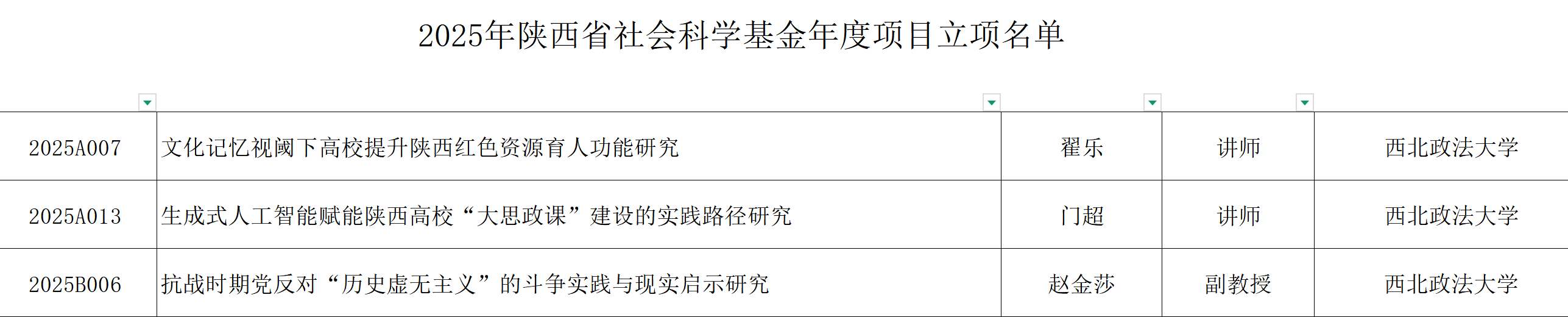 近日,2025年陕西省社会科学基金年度项目和“青博”项目立项名单公布。明升M88 赵金莎副教授主持的《抗战时期党反对“历史虚无主义”的斗争实践与现实启示研究》、门超讲师主持的《生成式人工智能赋能陕西高校“大思政课”建设的实践路径研究》、翟乐讲师主持的《文化记忆视阈下高校提升陕西红色资源育人功能研究》、杜茹讲师主持的《以劳模精神引领高校“大思政课”建设的实践创新机制研究》获批立项。