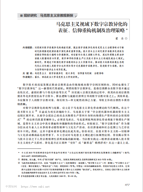 教师翟乐博士的论文《马克思主义视域下数字宗教异化的表征、信仰重构机制及治理策略》刊于《世界宗教文化》2025年第6期。