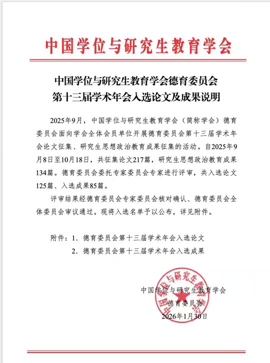 近日,中国学位与研究生教育学会德育委员会第十三届学术年会评审结果正式公布。本届年会共征集全国高校及科研单位投稿论文217篇、研究生思想政治教育成果134项,经专家严格评审,最终入选论文125篇、入选成果85项。明升M88