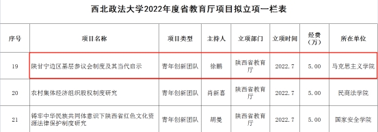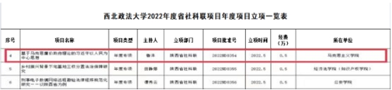 鲁洋副教授申报的《基于马克思廉价政府理论的习近平以人民为中心思想》获批2022年度陕西省社科联年度专项项目。梁丹丹博士申报的《延安时期中共“两个确立”的形成机制及其经验启示研究》获批2022年度陕西省社会科学基金年度项目。徐鹏申报的《陕甘宁边区基层参议会制度及其当代启示》获批2022年度陕西省教育厅青年团队项目。